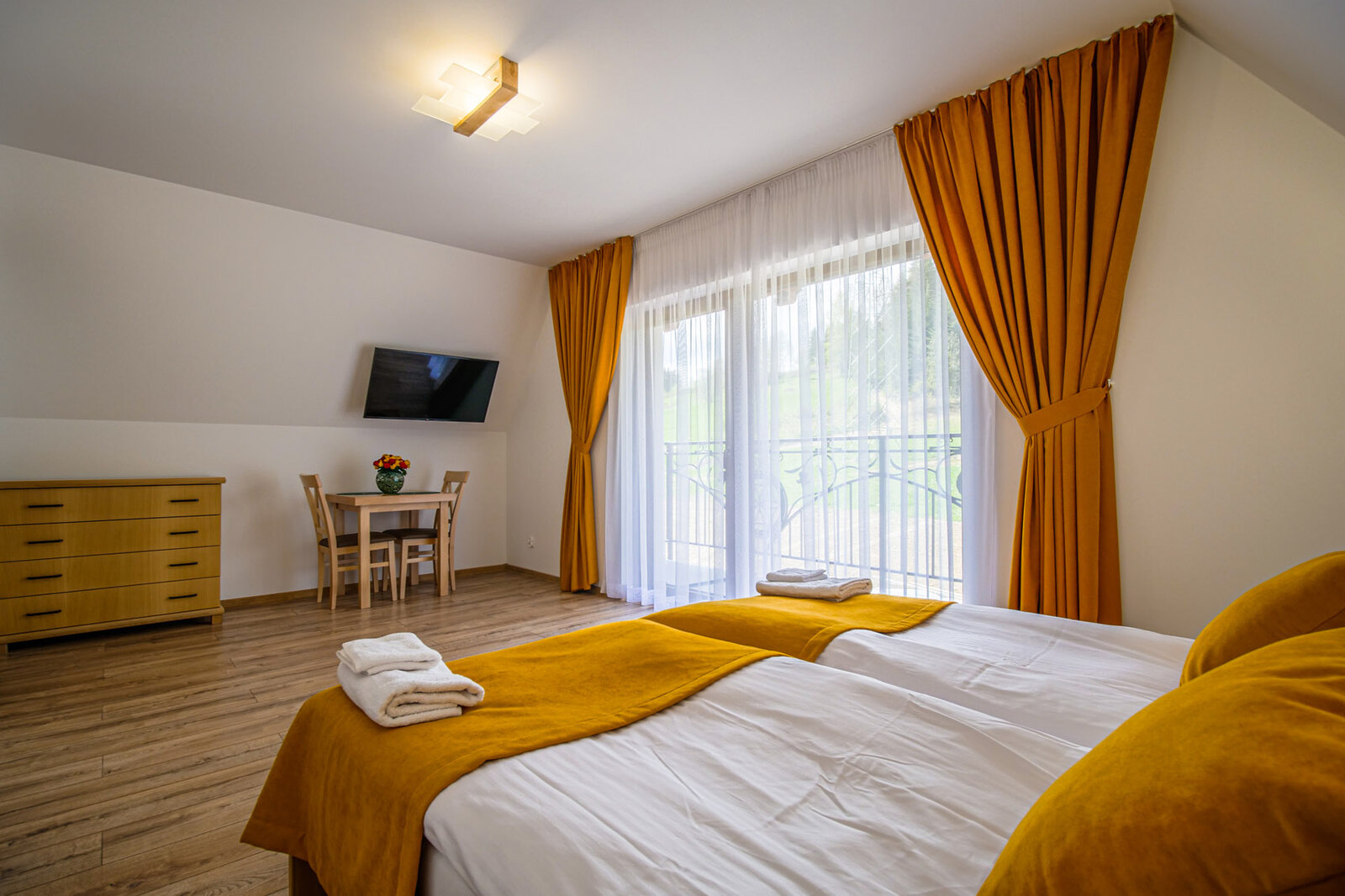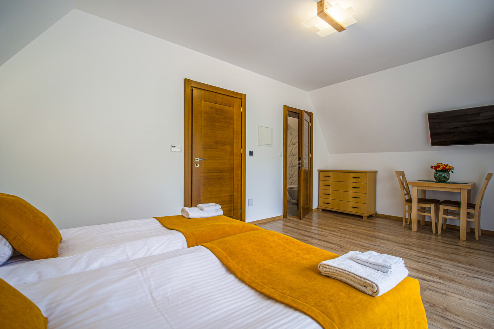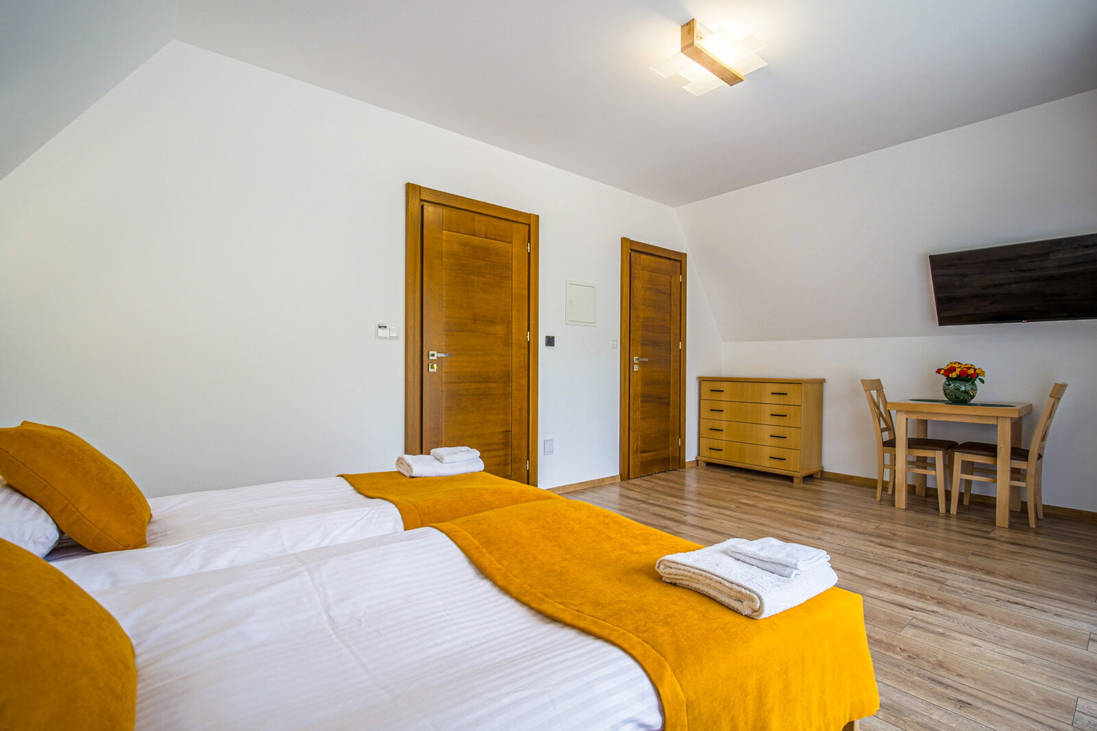 Pokój wyposażony jest w łóżka pojedyncze z możliwością łączenia, szafę z lustrem, stół z krzesłami, stoliki nocne oraz TV 42”.