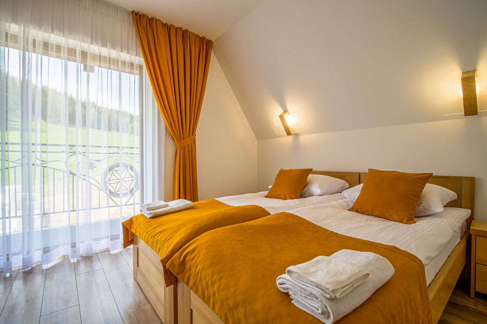 Posiada balkon z widokiem na baseny termalne oraz stok narciarski.