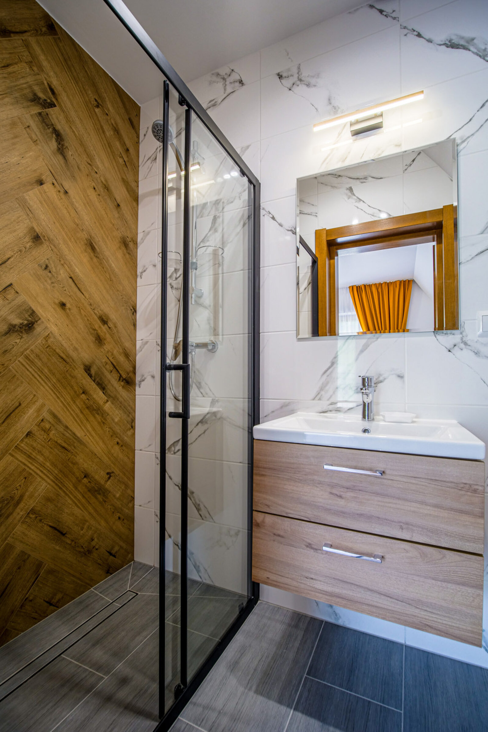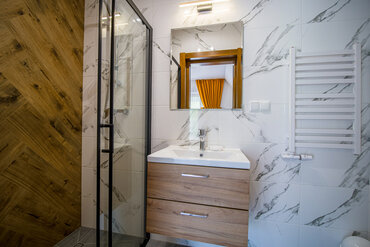 W łazience znajduje się kabina prysznicowa, toaleta, umywalka, suszarka do włosów oraz przybory kosmetyczne.