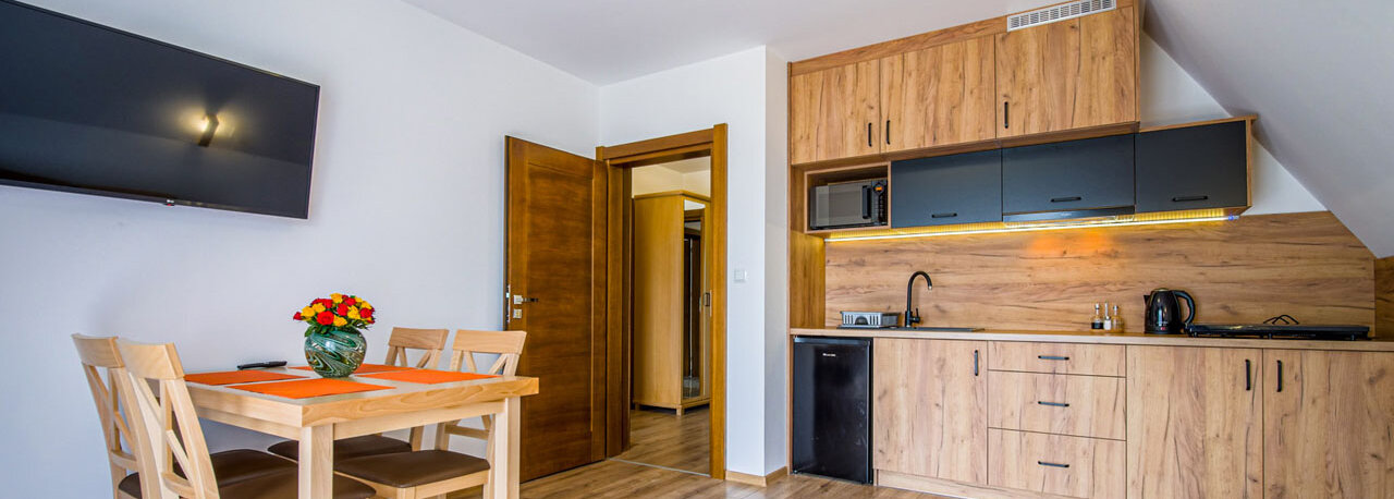Każdy z naszych apartamentów i pokoi wyposażony jest w TV, wygodne łóżko, stół z krzesłami, szafę lub komodę i stoliki nocne. W każdym pokoju znajduje się łazienka z kabiną prysznicową, toaletą, suszarką do włosów, ręcznikami oraz przyborami toaletowymi (np. mydło, szampon, żel do kąpieli). Apartamenty mają aneksy kuchenne na wyłączność natomiast pokoje dwuosobowe posiadają aneks kuchenny ogólnodostępny na korytarzu. Aneksy kuchenne wyposażone są w lodówkę, płytę indukcyjną, kuchenkę mikrofalową, czajnik elektryczny oraz opiekacz.